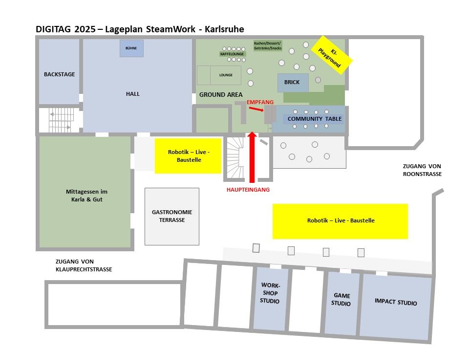Der Digitag'25 findet im SteamWork Karlsruhe statt – einem modernen Co-Working- und Eventspace mitten in der Karlsruher Südweststadt. Sie erwartet eine inspirierende Umgebung mit Industrie-Charme, flexiblen Workshop-Räumen und großzügigen offenen Flächen zum Austausch.